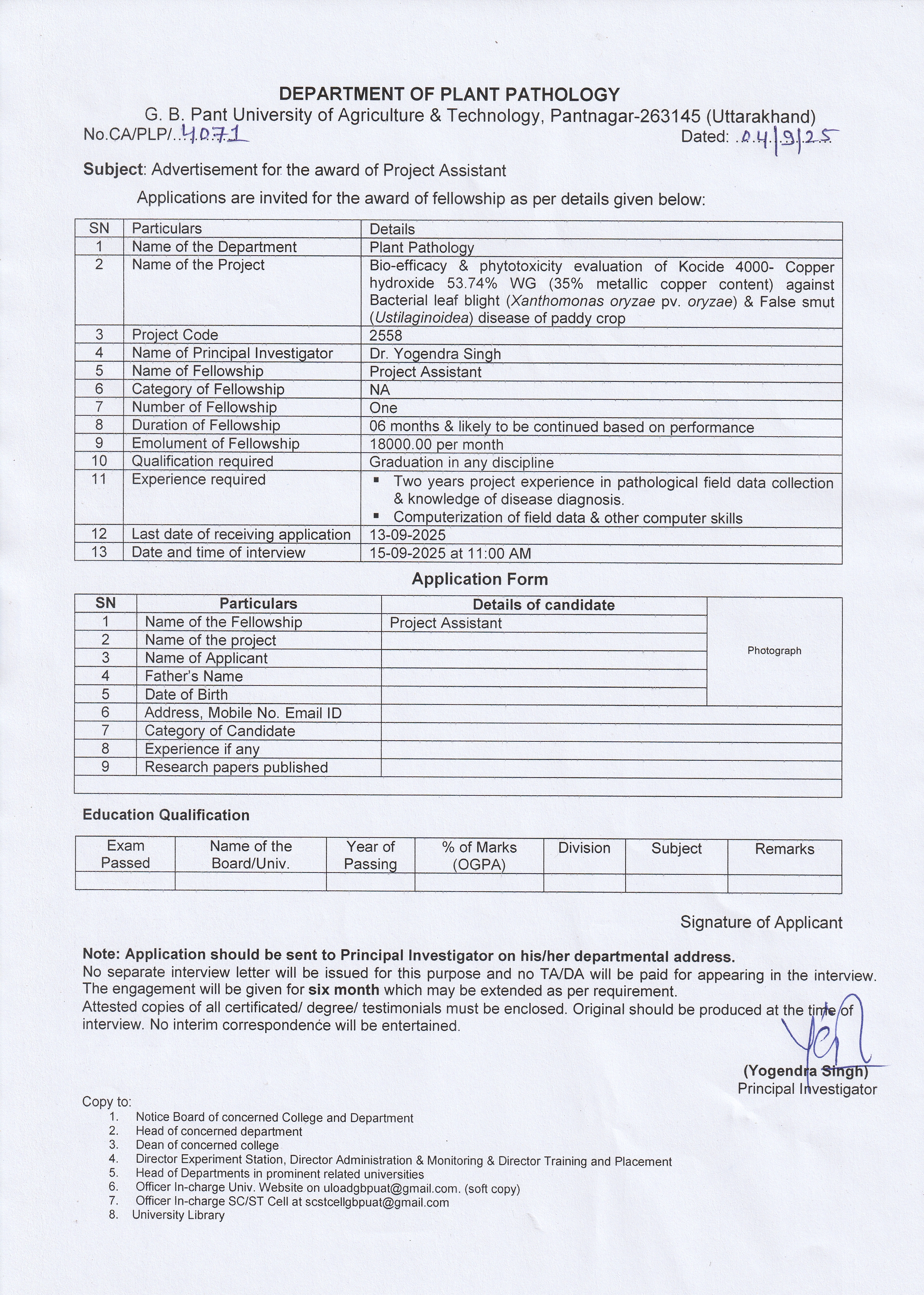 गोविंद बल्लभ पंत कृषि एवं प्रौद्योगिक विश्वविद्यालय, पंतनगर भर्ती 2025